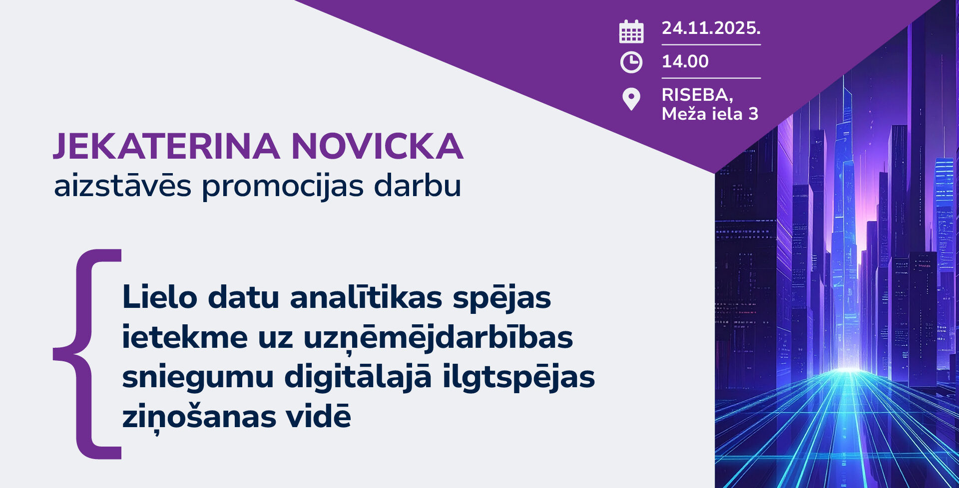 2025. gada 24. novembrī plkst. 14:00 Biznesa, mākslas un tehnoloģiju augstskolā “RISEBA” (augstskola RISEBA), Meža ielā 3, Rīgā notiks augstskolas RISEBA promocijas padomes atklātā sēde, kurā