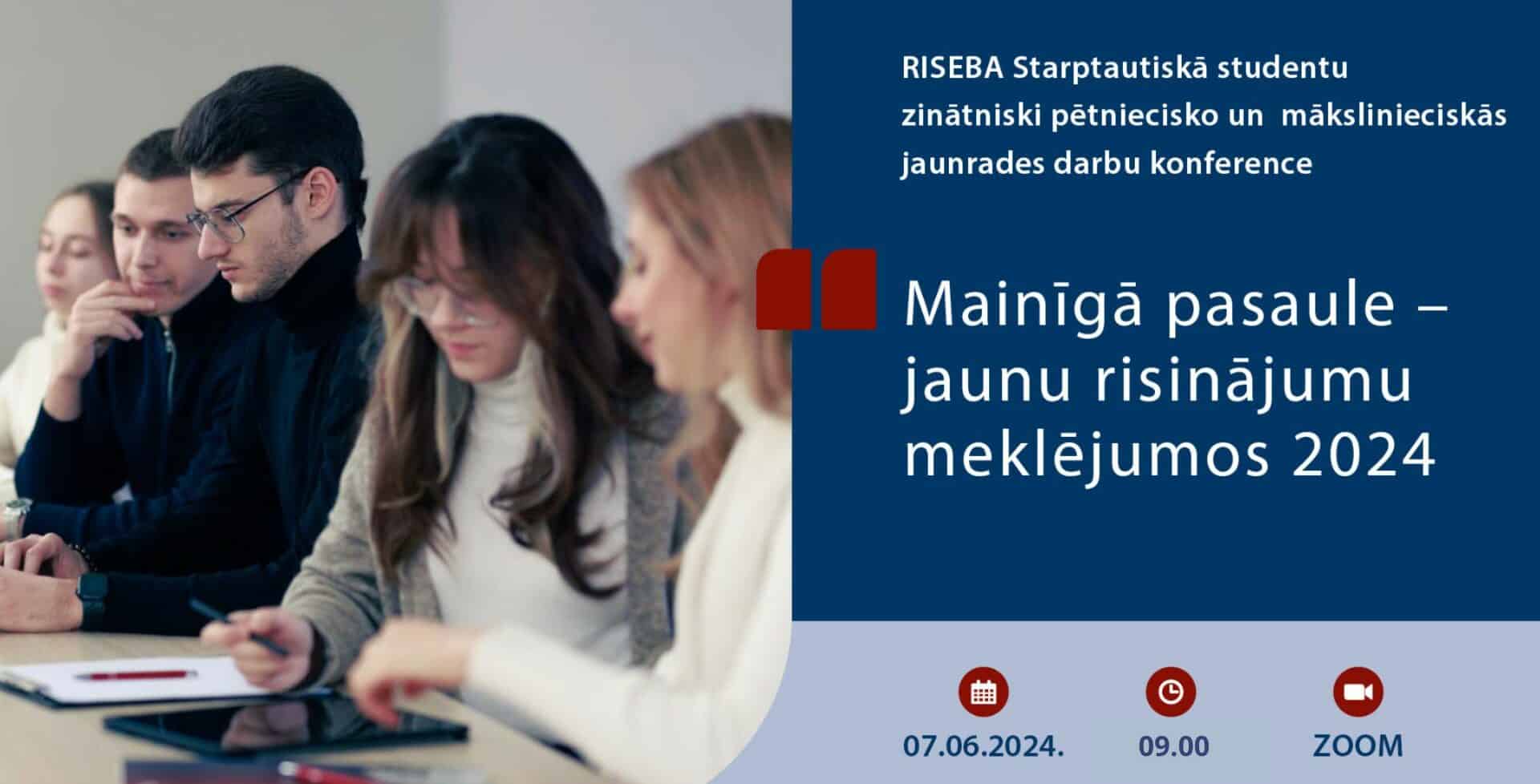 2024. gada 7. jūnijā augstskola “RISEBA” organizēs jau ikgadējo Starptautisko studentu zinātniski pētniecisko un mākslinieciskās jaunrades darbu konferenci “Mainīgā pasaule – jaunu risinājumu meklējumos 2024”.